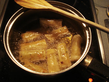 Y ahí es cuando entró mi cacho-carne en plan salvador de la noche. Cogió la botella de aceite y cientos de años de tradición culinaria ibérica y se frió los rollitos y las empanadillas en un cazo, exprimiendo al máximo el gen de la freiduría. Podéis ver la prueba en la foto.