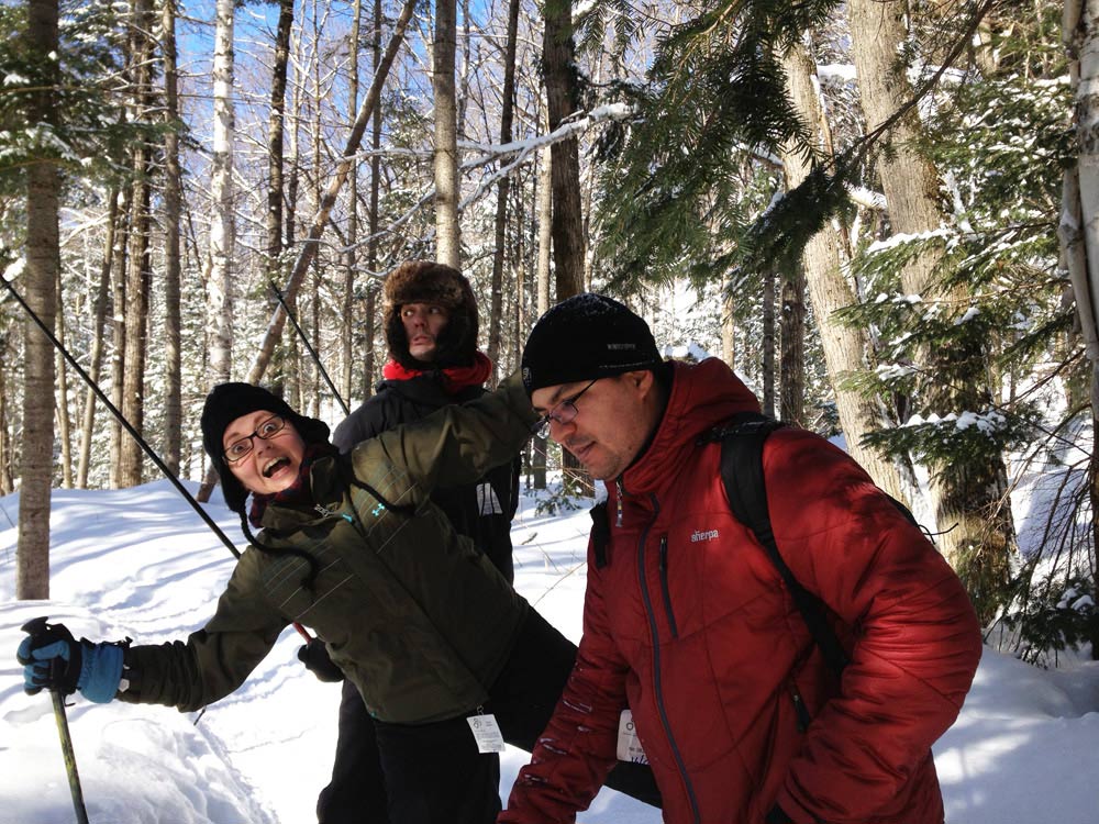 Como iba diciendo antes de ponerme meloso, nuestro hotel favorito forma parte de un paisaje idílico. Les Laurentides es una región envidiable, a una hora en coche al norte Montreal. En verano todo lo que ves es un bosque frondoso donde puedes hartarte a hacer camping, y en invierno estás en uno de los mejores sitios para los deportes de nieve. Así que el primer día, después de desayunar como si no hubiésemos comido en tres meses, nos plantamos en el Parque Regional Val-David – Val-Morin para probar a hacer senderismo con raquetas de nieve. No era mi primera vez con raquetas de nieve, pero existe una gran diferencia entre salir al backyard de tu tía en Vermont a dar una vuelta con los perros y pasarte cuatro horas subiendo y bajando montañas.