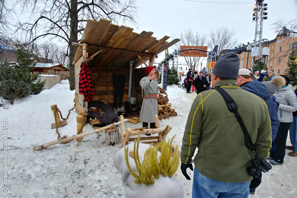 Pero con tanta cosa al aire libre en el frío, ¿cuál es de verdad el secreto para aguantar y sacar ganas para ir a ver más cosas? Pues que al lado de las actividades siempre hay una cabañita o una barra de hielo donde pedirte una cerveza, un vino, un carajillo o un chupito de licor de whiskey con jarabe de arce (muy rico, por cierto); y durante el carnaval no está mal visto pasarte el día bebiendo. Para entrar en calor, ojo, no en plan «vamos a cogernos el mayor moco de nuestra vida» como en las fiestas populares españolas. La vestimenta tradicional incluye un gorro rojo, una especie de bufanda/cinturón tradicional llamada Fléchée (y lo de bufanda/cinturón es literal, porque es para sujetar la ropa sin que te entre frío por el resquicio entre la camiseta y el pantalón) y de manera extraoficial una petaquita en el bolsillo.