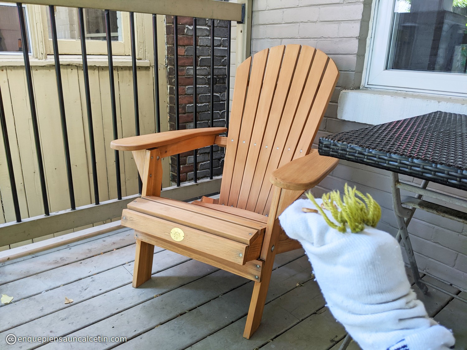 De hecho, pese a todo el uso que le hemos dado, la silla ha pasado más tiempo dentro que fuera. En verano, porque con la amenaza mapache prefería que no durmiese fuera no me la fuese a encontrar cagada y mordisqueada. Y los otros nueve meses del año porque los muebles de madera son poco amigos del frío y la nieve (vamos, que están poco pensados para Canadá), así que teniendo sitio dentro para qué íbamos a dejarla ahí fuera.