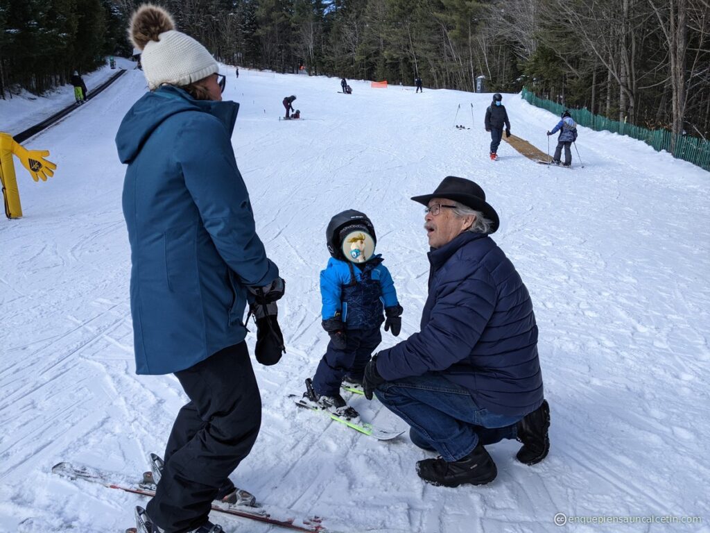 Para el esquí hubo que planificar un poco más, porque no basta con bajar al parque una tarde. Hay que encontrar una buena montaña (la cacho-wife necesita al menos una pista de cinco rombos negros y tres calaveras para divertirse), hace falta sacar pases (que con el coronavirus por ahí zurriendo significa reservar con antelación porque hay capacidad reducida), alquilar equipo…. vamos, hace falta cogerse una semana de vacaciones y plantarse en casa de los grand-parents en Quebec, que viven al lado de una estación de esquí bien maja, y además nos dan de comer y si ponemos ojitos hasta nos hacen la lavadora.