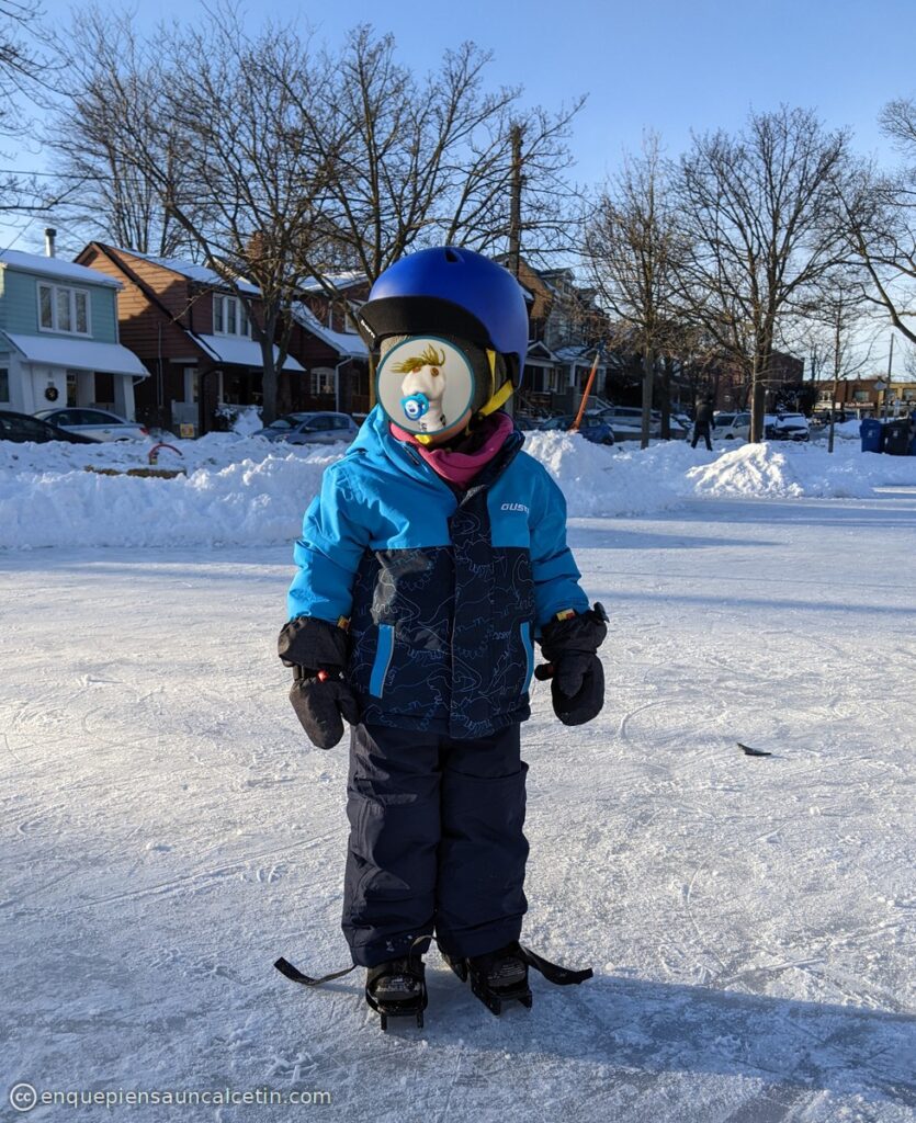 Por suerte, mientras mi cacho-carne se jugaba la vida intentando hacer fotos y vídeos mientras patinaba, el insitinto del canadiense nato salió a reducir y, un segundo después de haber tocado el hielo, el cachito-carne estaba andando de un lado para otro. Lo de andando es literal, porque las dos cuchillas del bob skate dan mucha estabilidad y no hace falta pensar mucho en la técnica. Se lo pasó tan bien que echamos la tarde entera y volvimos al día siguiente a por más. Lo único un poco preocupante es que también se interesó mucho por lo que estaban haciendo unos niños que había jugando al hockey, y eso entra en competencia directa con los intereses deportivos familiares… pero no os preocupéis que ya hemos intervenido y en dos semanas empieza unas clases de baloncesto.